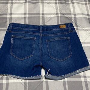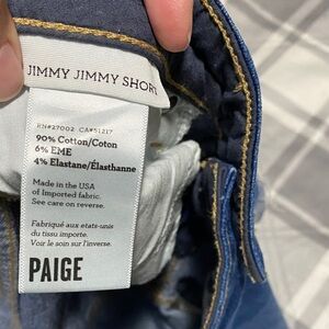 Chic Paige Jimmy Jimmy distressed denim shorts size 27. Perfect for casual wear. All measurements are approximate and taken with garment laying flat: waist measures approximately 15 inches across, rise 8 inches, inseam approximately 4 inches.