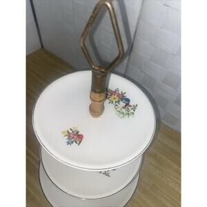 Wooden spindle in between. Brass topper. Floral bouquets on each level. Gold edging