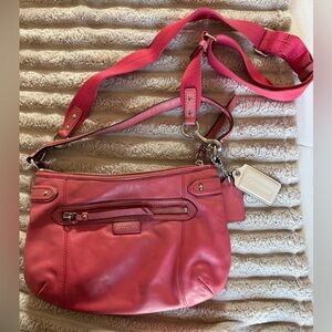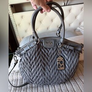 Stylish Coach satchel with signature pattern. Features black and gray tones. Ideal for versatile use.
