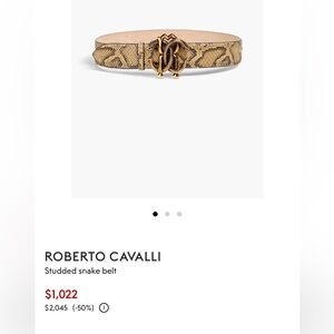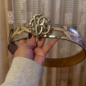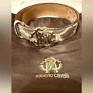Authentic Roberto Cavalli genuine leather belt featuring luxurious python-pattern leather and iconic RC logo gold-tone buckle. Crafted in Italy with exceptional quality and bold designer style. Comes with original Roberto Cavalli dust bag. Perfect statement accessory for dresses, jeans, or tailored looks.