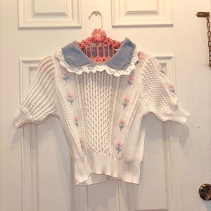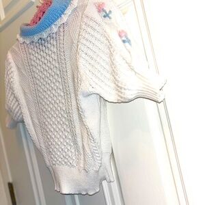 Handmade hand knit Cottagecore Short Sleeve Small Floral Embroidered Sweater