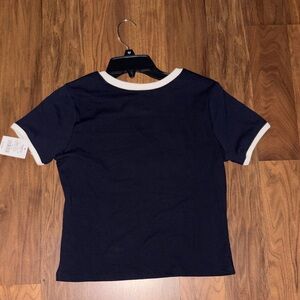 Navy Peanuts tee featuring white trim. Classic and stylish design.