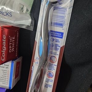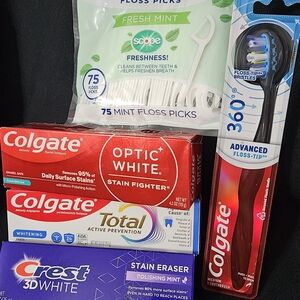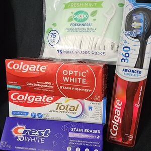 Achieve a brighter smile with the Colgate Optic White and Crest 3D White toothpaste set. This bundle includes Scope Fresh Mint floss picks for added freshness. Perfect for daily oral care.