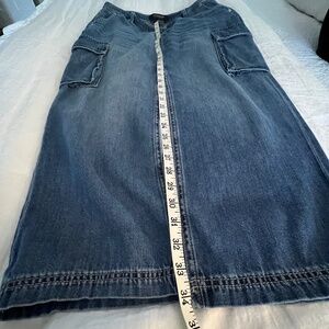 This skirt runs very large in my opinion so don't let the size 4 deter you (see measurements below). Faded lightweight denim with front whiskering and zip fly with a button closure. This Maxi length cargo skirt has a split front with front and back pockets, belt loops and side cargo pockets. Color is Willow Glen; fabric is 81% cotton and 19% rayon. Sits at the low waist (mid rise) and a must-have for your wardrobe. Comes from smoke-free home.