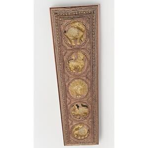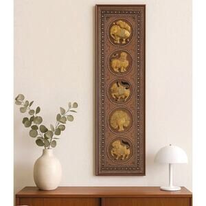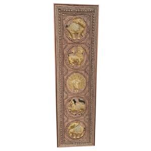 Exquisite handcrafted Burmese / Thai Kalaga textile wall art featuring intricate appliqué embroidery, glass beadwork, and metallic threadwork on rich velvet. The vertical panel displays four ornate medallions—two elephants, a lion, and a peacock—each rendered in padded relief for a dimensional, sculptural look.