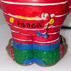 - The back features “Peace” detail on his belt. A fun and festive piece from the 1990s