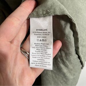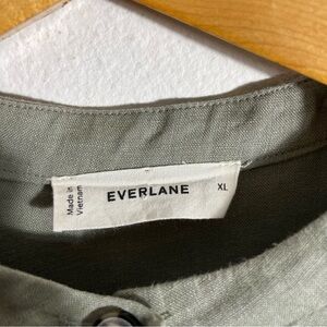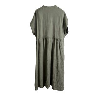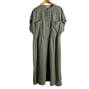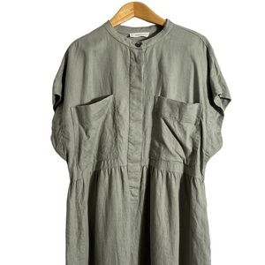 EVERLANE The Craft 100% Linen Short Sleeve Midi Dress in Sage Green. Relaxed oversized fit. Midi length. Front placket with hidden button closure. Stand collar. Dide seam pockets. Two patch chest pockets.