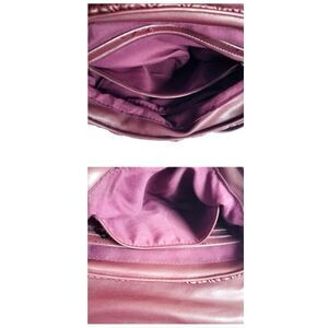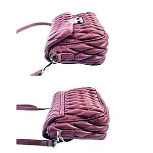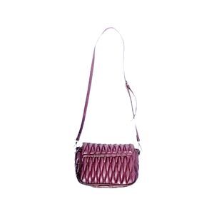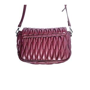 In Mini Quilted Messenger Bag style, bag features a burgundy/plum colored vegan leather, quilted exterior, and gun metal colored hardware. It has flap and push lock closure, revealing a fabric lined interior with a zipper pocket on the rear wall, and an open pocket on the front wall. The shoulder strap is both adjustable and removable.