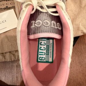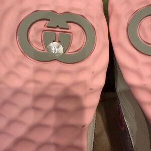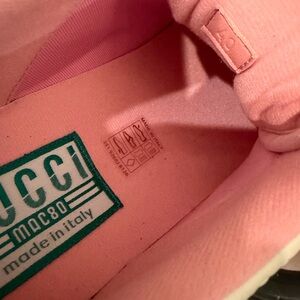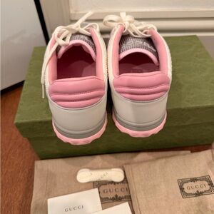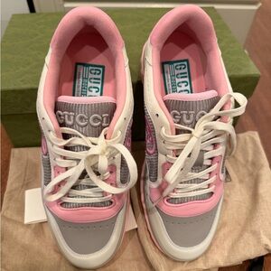 Stylish Gucci sneakers with a pink and gray color scheme. Perfect for casual wear.