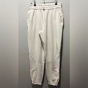 Elevate your style with these chic cream pants. Designed for comfort and elegance, they feature an elastic waist for a perfect fit. Ideal for any occasion. Used Condition. The ribbed portions of the pants have significant wash wear. Must be the fabric - these pants are otherwise stunning . Super soft Draws pull 2 Pockets Waist 14 in Inseam 28 in No stains or rips