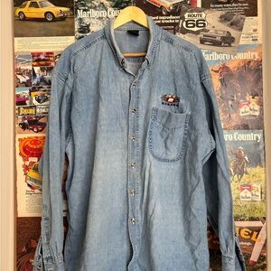 Classic men's denim button-up shirt with a stylish embroidered logo on the pocket. Perfect for casual outings or a laid-back office look.