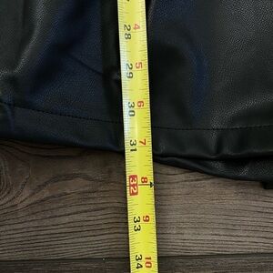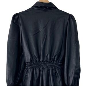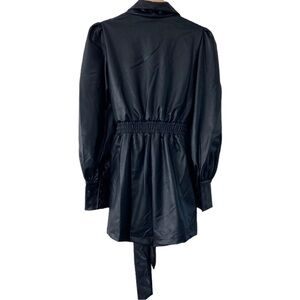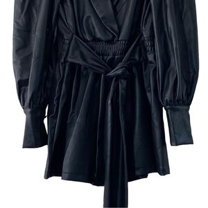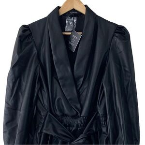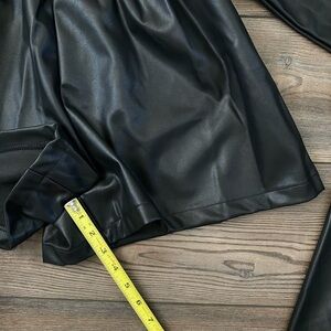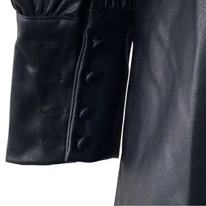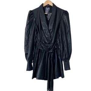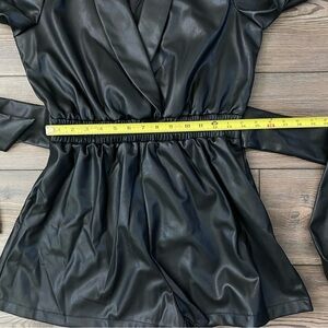 Area Stars Faux Leather Blazer Romper. Black faux leather, collared romper with side zipper closure and long bishop sleeves. Please see pictures for more details and measurements.
