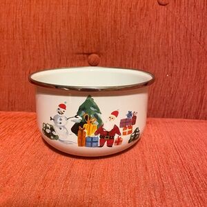 Celebrate the season with this charming holiday bowl featuring a delightful Santa and snowman design. Perfect for adding a festive touch to your home decor. Metal. Cute candy bowl!