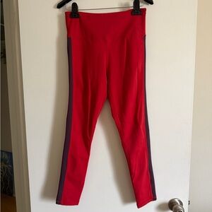 Stylish red leggings with a bold black stripe. Perfect for workouts or casual wear.
