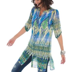 {Chico's} Multicolor Ikat Abstract Print Button-Down Tunic Blouse