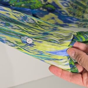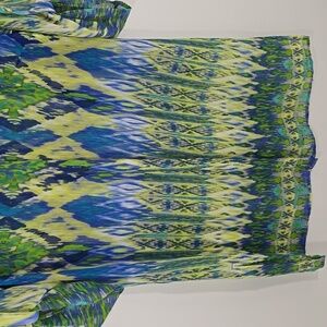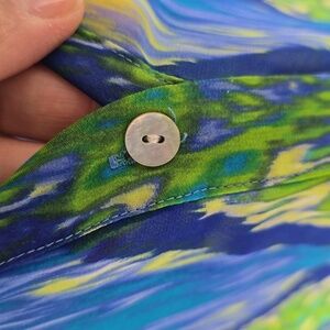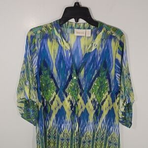 Chico's blouse with a striking abstract pattern. Features vibrant blue and green hues. Ideal for a bold fashion statement.