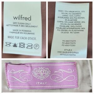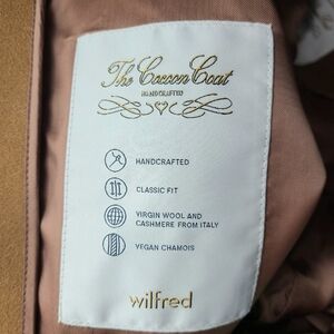 Aritzia Wilfred The Cocoon Cashmere Italian Wool Tan Coat. Features a funnel neck, hidden placket closure, in a virgin wool cashmere material. Handcrafted. Modern and chic. Please see photos for materials and care instructions. Tiny bit of launder wear to inside lining, tiny area of wear near pocket, see photos. Very good condition.