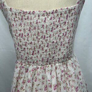 A delicate summer dress that embraces feminine charm through its soft white background adorned with tiny pink floral prints. The design features a flattering smocked bodice, square neckline, and full-length silhouette with strategic button detailing and tiered skirt for movement and grace.