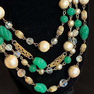 The necklace is beautifully constructed with layered bead and chain strands and a prominent green cabochon connector element. The brushed circular backplate and box clasp construction are consistent with known Weiss production from this period. Unsigned, as is common with many Weiss necklaces.