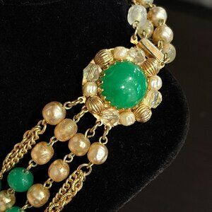 1950s Weiss-style Multi Strand Faux Jade Cotton Pearl Crystal Bead Bib Necklace