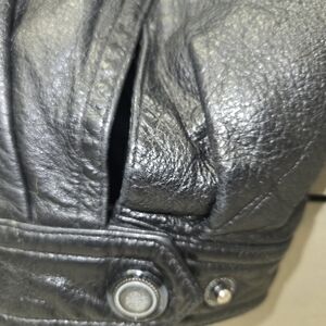 Classic black leather bomber jacket. Features a sleek design. Ideal for versatile styling.