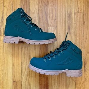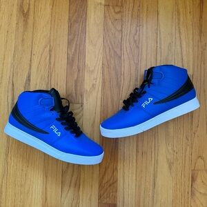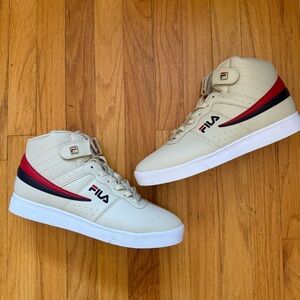 Stylish Fila high-tops in baby pink. Perfect for casual wear. Brand new with slight scuffs from storage. MISSING insoles!! You can always add your own. Not sure if they ever came with them or if they were taken out at some point. ***Also, front Velcro strap is cut off*** Shipping **without** box!! I will recycle it for you!