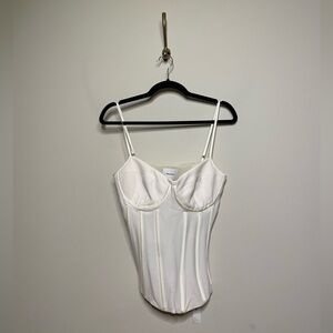The Reformation Rosetta Top is a sleeveless top with a sweetheart neckline, bust cups, and front-seam detailing.