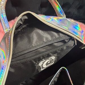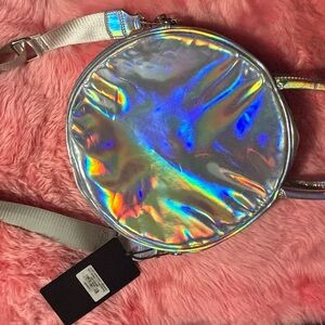 KILLSTAR Baby Baphomet Handbag Holographic Round Pink —Shine with this stunning holographic round shoulder bag. Perfect for adding a touch of iridescent flair to any outfit. Sold out on the website.