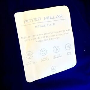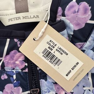 "High performance construction paired with ultra stretch knit provides exceptional versatility & comfort. - Wind resistant - 4-way stretch - Water resistant - Easy care" Beautiful lightweight Golf Jacket from Peter Millar. Full zip in front with 2 front zip pockets. Navy & lavender floral, quilted body for extra warmth. Retail $230. Size Medium.