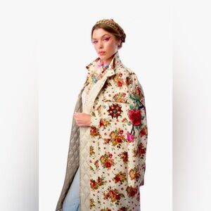 NWT Floral print button-up coat with embroidered floral patch sewn on the left sleeve, 2 front pockets, left pocket with royal badge, slight high-low hem, detached quilted liner as lining, sleeveless lining. Self fabric: 90%cotton, 10%linen, lining 100% polyester. Never worn. Needed a different size.