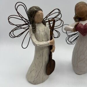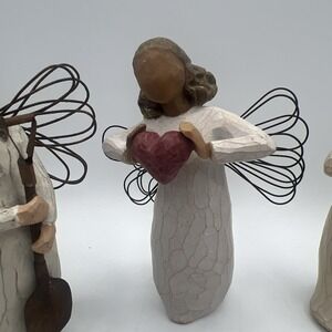 This lot of 3 Willow Tree figurines by artist Susan Lordi includes "With Love" and "Thinking Of You" from 2006. These medium-sized figurines feature a traditional style with a 3D effect, perfect for any room and occasion. Made of beige-colored resin with a natural finish, these Guardian Angel figurines are part of the romantic Willow Tree collection. The figurines stand at 5.5 inches tall and come in a pack of 1, each weighing 8 oz, making them a sentimental addition to any collection or decor.