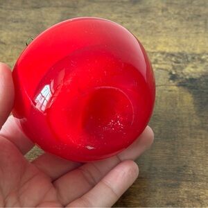 This piece has a beautiful saturated ruby red body with a darker green pulled glass stem and leaves. It’s solid and nicely weighted, making it perfect as a paperweight, shelf accent, or kitchen display piece.