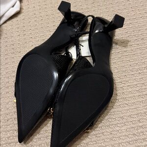 Elegant black heels with gold accents. Sleek pointed toe design. Perfect for any occasion.