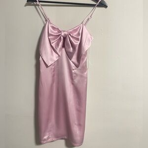 Chic pink satin chemise with a large bow accent. Ideal for a stylish night in.