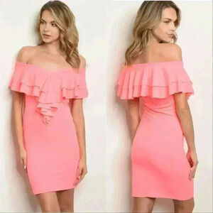 NEON BODYCON RUFFLE OFF SHOULDER DRESS