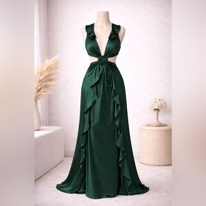#hotmiamistyles #darkgreendress #satindress #cutoutdress #maxidress #eveninggown #formaldress #weddingguest #statementdress #glamdress