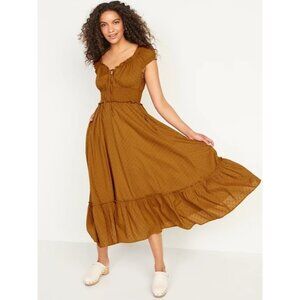 This Old Navy babydoll maxi dress features a smocked waist for a flattering silhouette, swiss dot texture, and ruffle details for added charm. With two functional slash pockets and a flowing miner's gold hue, this dress combines elegance with practicality, making it both stylish and versatile.