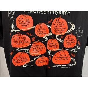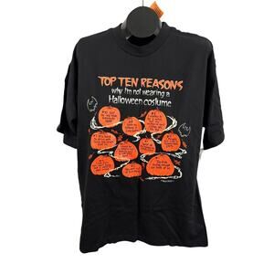 Authentic vintage 1991 Halloween graphic tee by Brieland Graphics (Tempe, Arizona). Original early 90s novelty shirt featuring “Top Ten Reasons Why I’m Not Wearing a Halloween Costume” pumpkin design with glow-in-the-dark print.