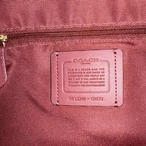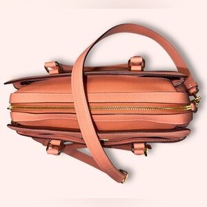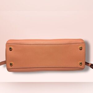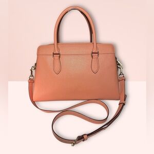 Beautiful Coach structured leather satchel in a soft coral/peach tone with gold hardware. This is a classic everyday carryall — roomy interior but still feminine and polished.