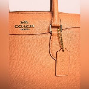 coach purse, coach satchel, coach crossbody, leather handbag, everyday bag, work bag, teacher bag, office bag, carryall purse, structured handbag, peach purse, coral handbag, spring purse, designer handbag, gold hardware