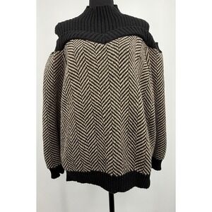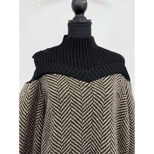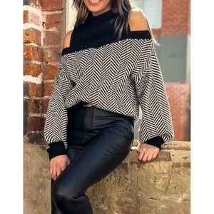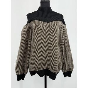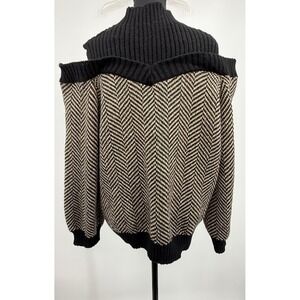 Black Taupe Chevron pattern, cold shoulder Sweater, Ribbed Mock neck, long sleeves with ribbed cuffs.
