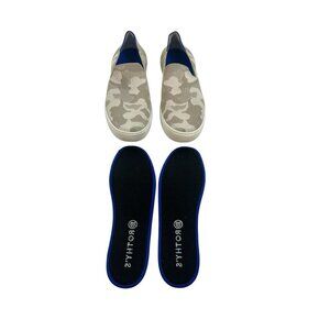 The Rothy's The Original Beige Camo Women's 9.5 Knit Fabric Slip-On Sneaker is a stylish and comfortable option for women looking for a casual shoe. Featuring a round toe shape, slip-on closure, and flat heel, these sneakers are perfect for travel or everyday wear. The knit fabric upper and foam insole provide comfort and support, while the rubber outsole ensures durability. With a camouflage pattern and designer theme, these sneakers are a versatile choice for any season. Perfect for walking, school, or running errands, these slip-on sneakers from Rothy's offer both style and practicality. in really nice clean condition the wear is minimal