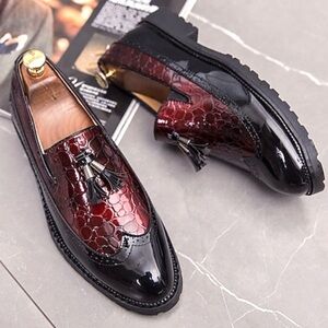 Step out in style with these elegant shiny black and brown oxford slip on loafers. Made from faux leather, these loafers feature a unique metal theme with toning accents and a medallion detail.