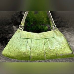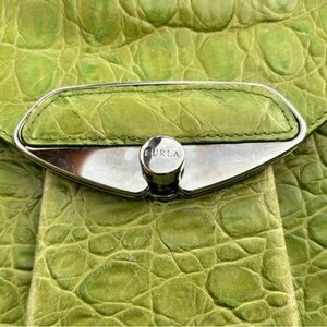 This is a vintage Furla leather baguette crocodile-embossed shoulder bag in intense shades of green with cool silver hardware. Plenty of life left in this bold Italian beauty.