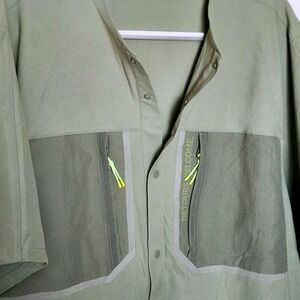 A water-repellent hiking shirt designed for staying cool and dry on the trails. This classic-fit short-sleeve top features a unique snap-up design and large mesh underarm panels to prevent overheating while climbing. The fabric is abrasion-resistant, with mesh fabric panels under the arms for letting off steam. It also boasts zippered chest pockets with the phrase "Detours Welcome" inside one of the mesh panels and provides secure storage for essentials during outdoor activities. MSRP $118.
