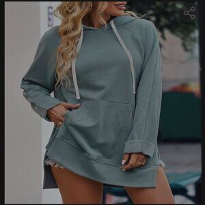 Women's Oversized Casual Pullover Long Sleeve Split Hem Drawstring Hoodies Dress With Kangaroo Pocket.