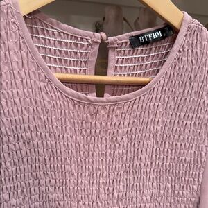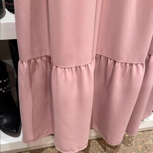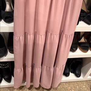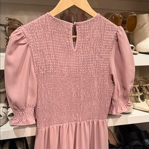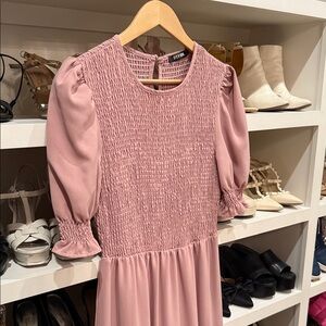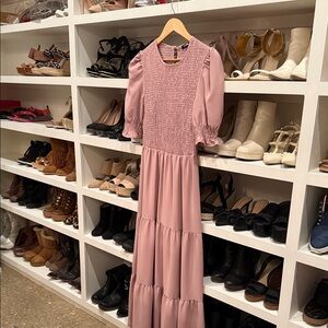 This chic mauve maxi dress features long sleeves and a smocked bodice, offering both style and comfort. Perfect for any occasion.