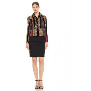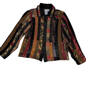 Coldwater Creek Jacket Womens Size Small Petite Black Multicolor Patchwork Stripe Crazy Quilt Sequined Ribbon Bohemian Artsy