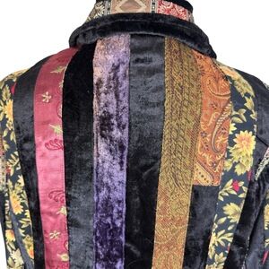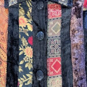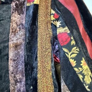 Tags: patchwork, velvet, sequined, crazy quilt, bohemian, artsy, eclectic, statement, unique, fall, winter, evening, artisan, art to wear, boho