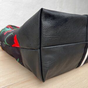 The black nylon with colored tropical flower print is bright and bold, the interior is exceptionally clean, and the white striped straps are bright, crisp, and clean. There's one tiny ding on the bottom corner (shown in pictures), no other marks, great pre-owned condition for this adorable weekender from the twenty-tens.